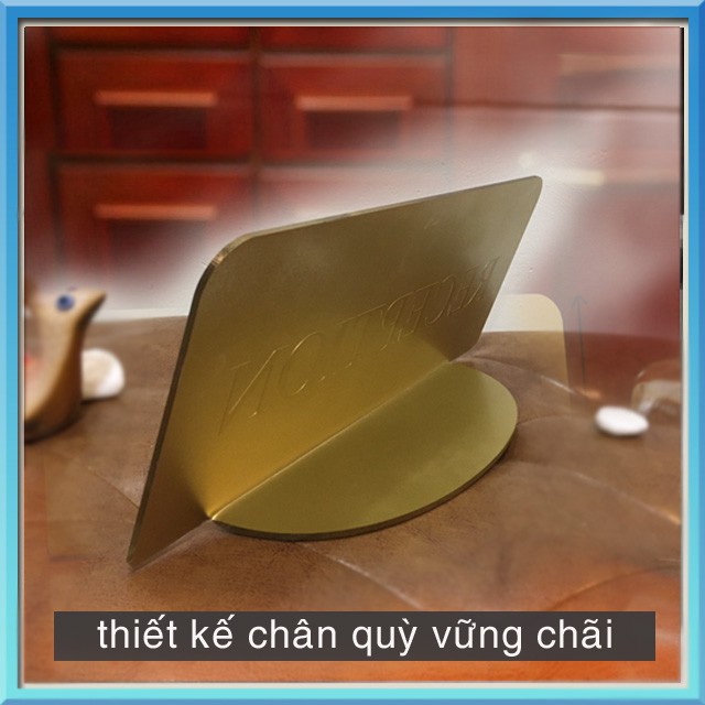 Biển quầy lễ tân để bàn bằng mica màu vàng đồng. Giá 250.000 đồng/c